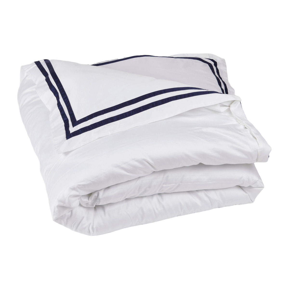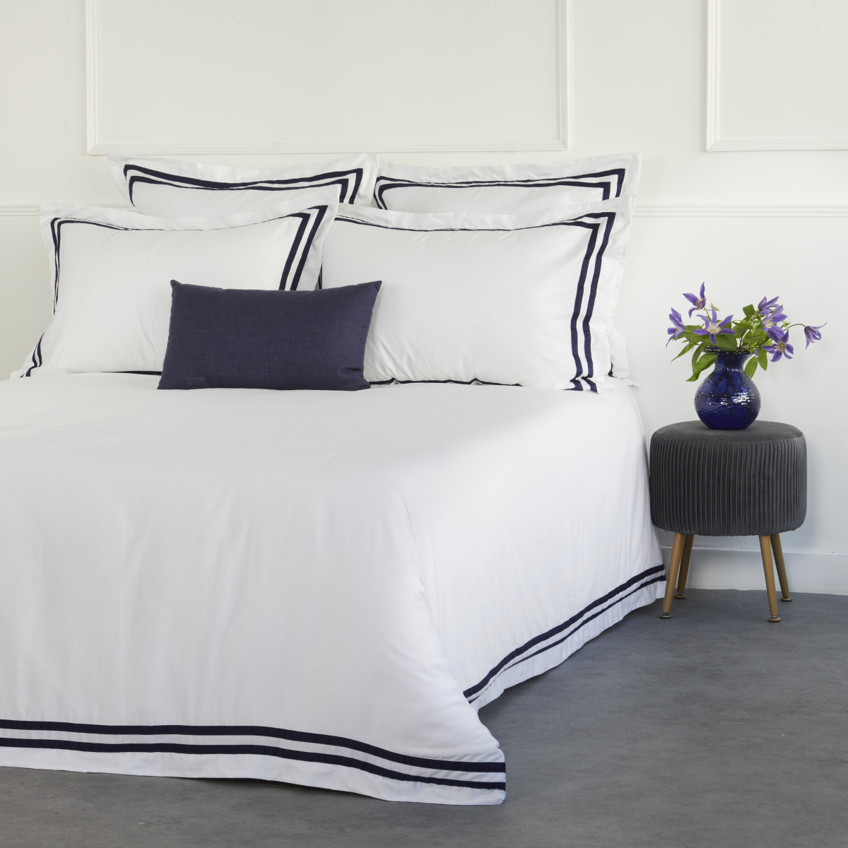 Conçue dans un luxueux satin de coton blanc, cette collection apporte une touche chic à votre chambre à coucher. Son élément distinctif est la bande appliquée en couleur marine qui forme un parement autour de la housse de couette et des taies, ajoutant une dimension visuelle unique et un contraste subtil.