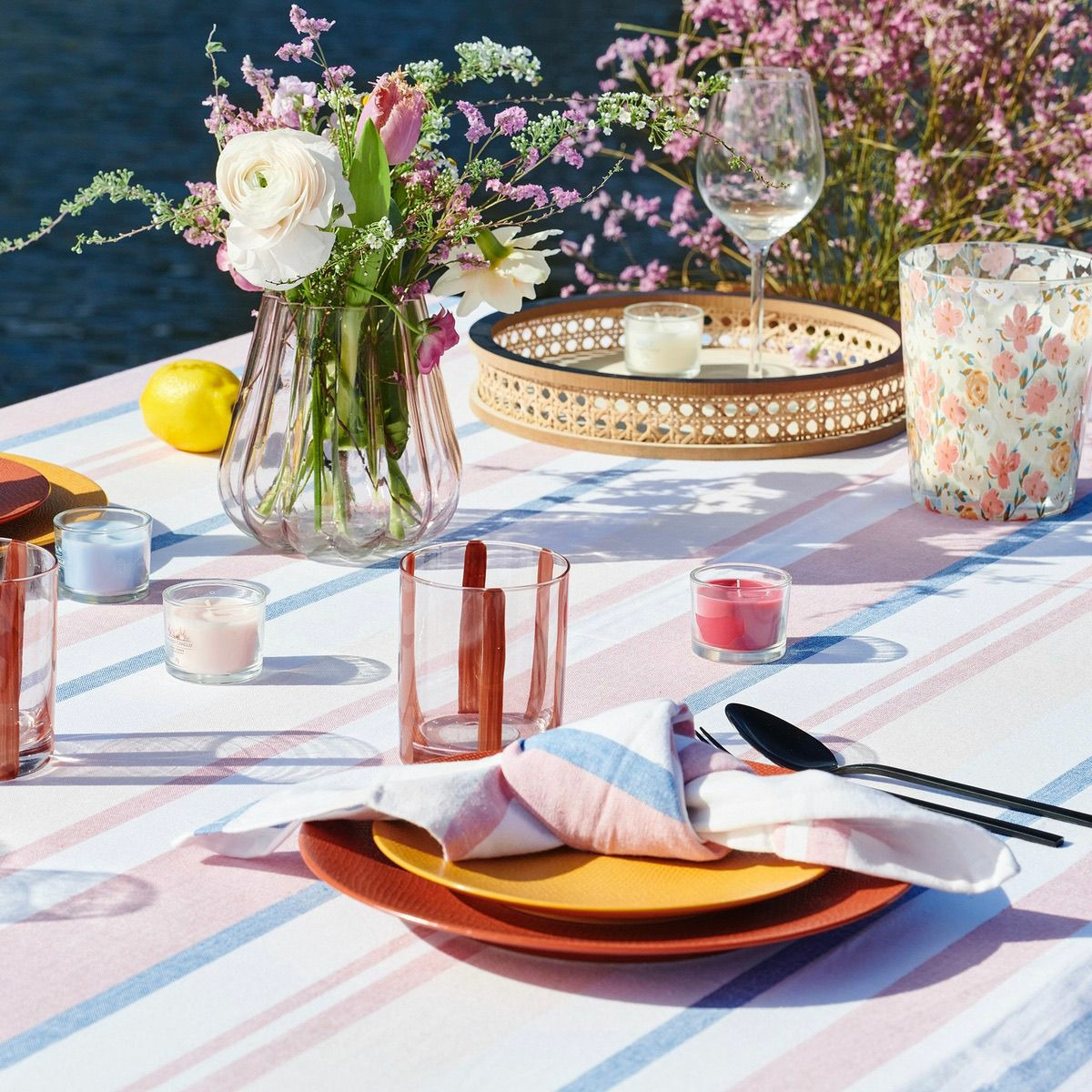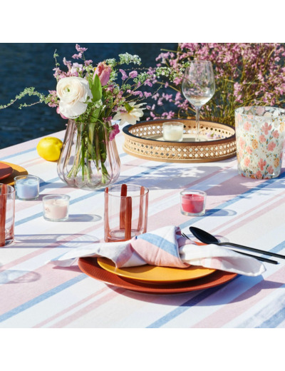 Le linge de table rayé bleu, blanc et rose Tradition des Vosges est sans aucun doute un produit incontournable. Fabriquée en 100% coton tissé teint, la nappe de cette collection printanière offre une sensation agréable au toucher et saura rehausser votre décoration.