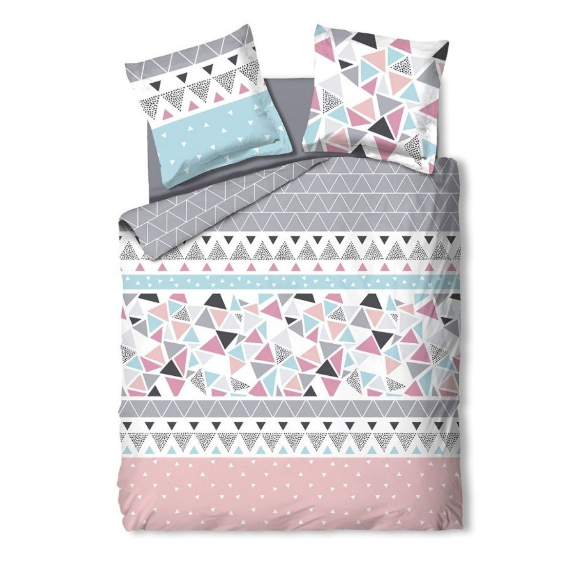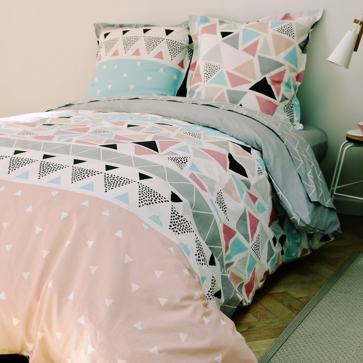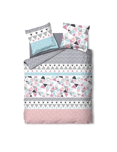 nuance rose, bleu, blanc et gris. Découvrez le linge de lit Louise, 100% coton, fabriqué avec savoir-faire, vous garantissant une belle qualité à petit prix. Imprimés de formes triangulaires.
