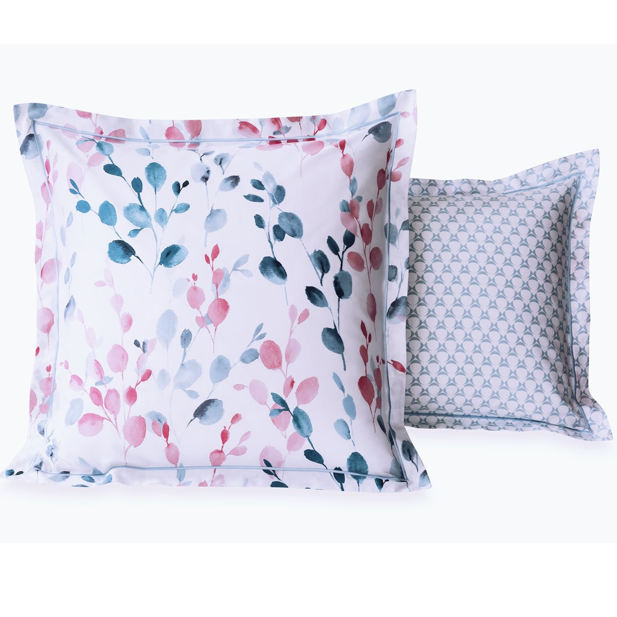 Cette taie est confectionnée avec un volant plat orné d’un parement encadré d’un bourdon, ajoutant une touche de raffinement à ce modèle. Elle est double-face : une face avec motifs végétaux, une face avec motifs géométriques.