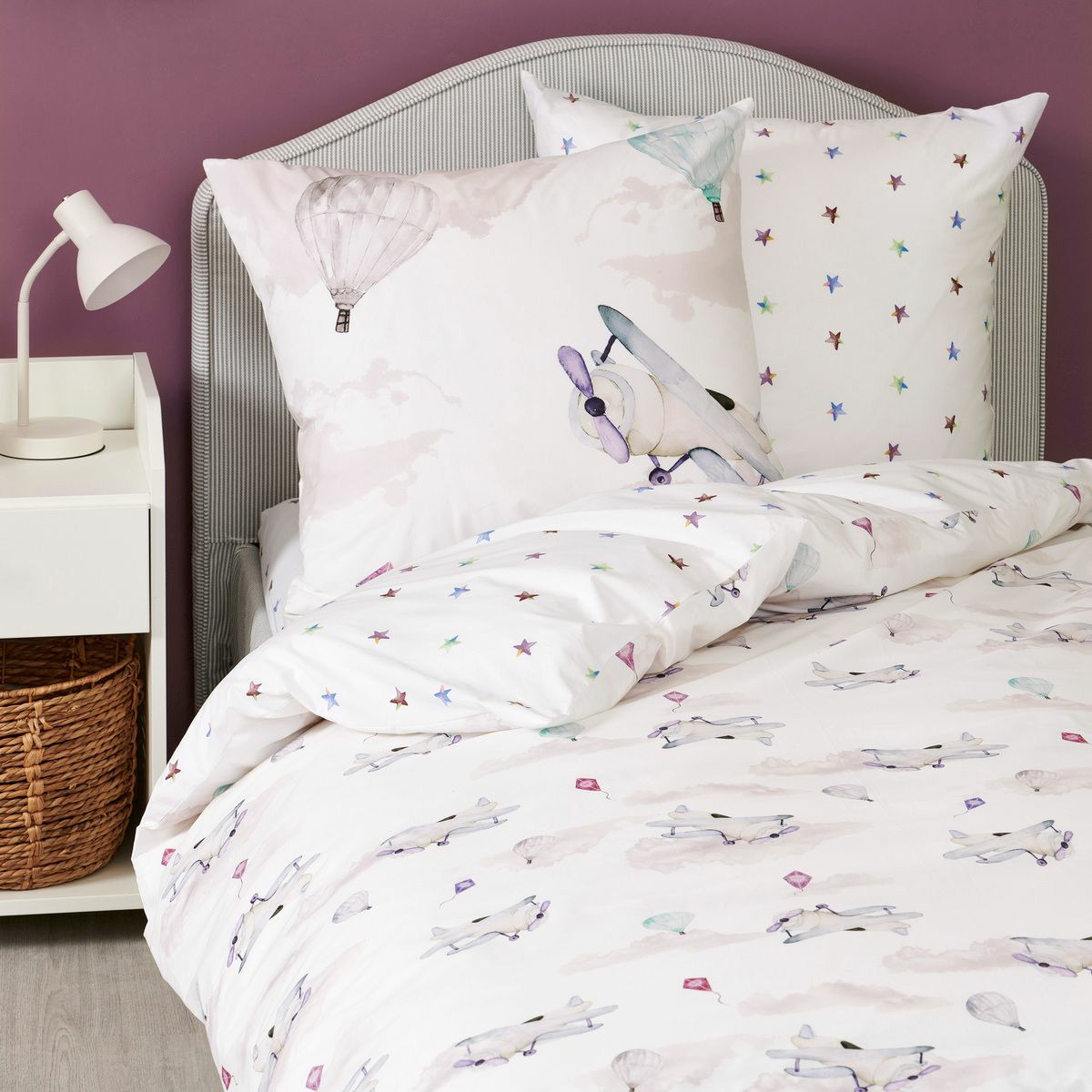 Transformez la chambre de votre enfant en un univers onirique grâce à cette parure de lit pleine de tendresse. Motifs d’avions, montgolfières et étoiles multicolores invitent à l’évasion et stimulent l’imaginaire des petits aventuriers. Son design réversible permet de changer d’ambiance en un clin d'œil : un côté avec des illustrations de voyage, l’autre parsemé d’étoiles colorées.