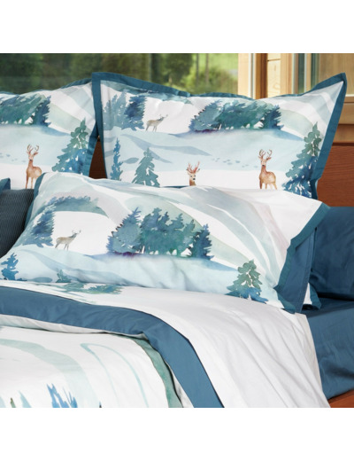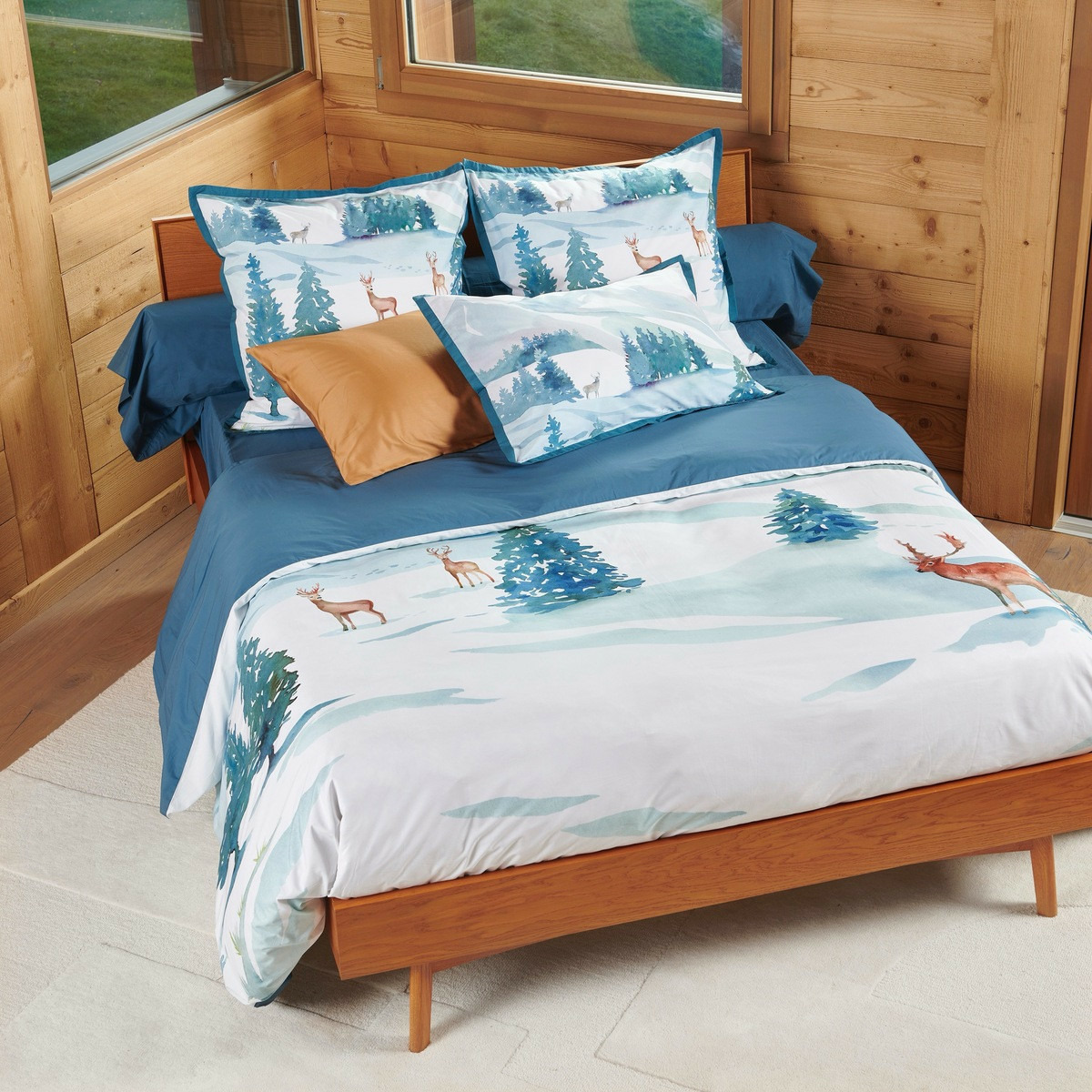 La collection Légende des Cimes est réalisée en percale 100% coton 120 fils/cm², une matière douce, fraîche et durable qui apporte un confort haut de gamme au quotidien. Son motif aquarellé évoque les paysages d’hiver, mêlant sapins enneigés et cerfs délicatement dessinés pour créer une ambiance chaleureuse et poétique dans la chambre. Cette parure est pensée pour offrir à la fois élégance, douceur et longévité.