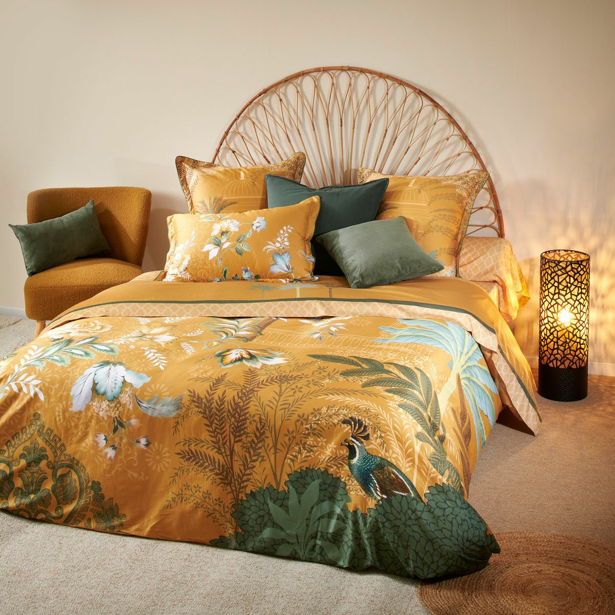 La parure Pavillon des Songes invite au voyage et à l’évasion grâce à son imprimé luxuriant aux accents botaniques et animaliers. Réalisée en satin de coton 120 fils, elle offre un toucher soyeux incomparable et une brillance délicate, gage d’élégance et de confort absolu.