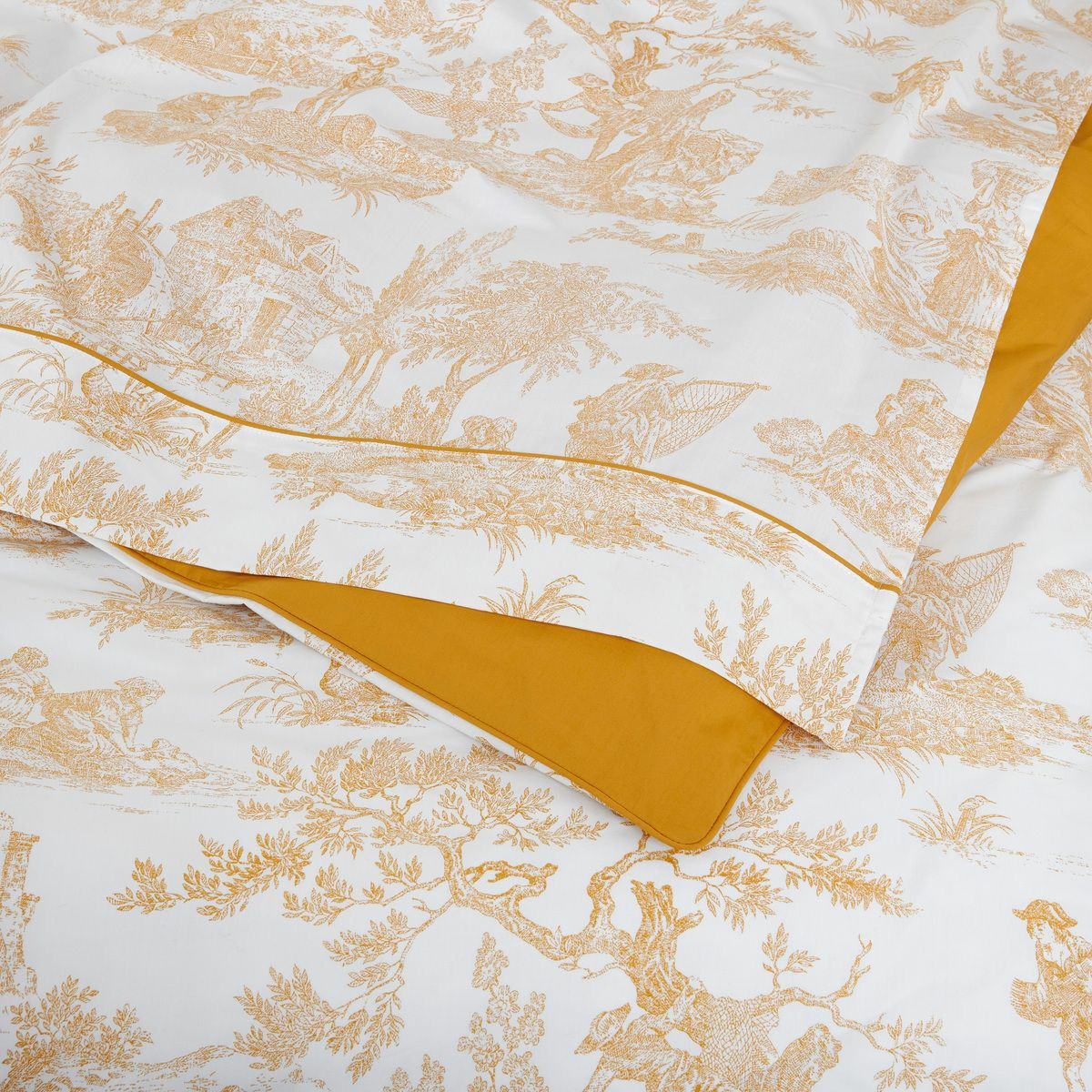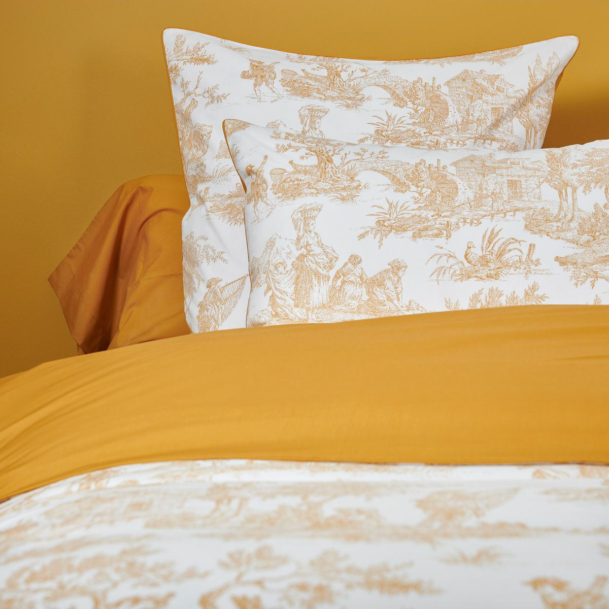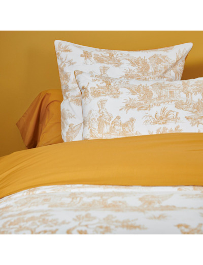 Plongez dans un songe doré avec la parure Rêve en Or, douce invitation à l’évasion. Sur une percale de coton 80 fils/cm², la délicatesse d’une toile de Jouy se dessine en fil d’ambre, comme un récit ancien murmuré à l’oreille. Les scènes bucoliques s’animent sur un fond lumineux, tandis que le revers uni couleur ocre évoque la chaleur d’un soleil couchant.