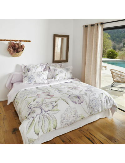 Son design floral aquarellé met en scène de délicates fleurs aux nuances subtiles de violet, de vert tendre et de rose poudré. Cette composition raffinée crée une ambiance romantique et apaisante, idéale pour une chambre empreinte de douceur. Son revers est unie rose pâle pour varier les styles selon vos envies, offrant une touche plus sobre et élégante.