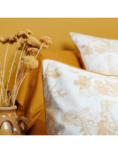 Plongez dans un songe doré avec la parure Rêve en Or, douce invitation à l’évasion. Sur une percale de coton 80 fils/cm², la délicatesse d’une toile de Jouy se dessine en fil d’or, comme un récit ancien murmuré à l’oreille. Les scènes bucoliques s’animent sur un fond lumineux, tandis que le revers uni doré évoque la chaleur d’un soleil couchant.