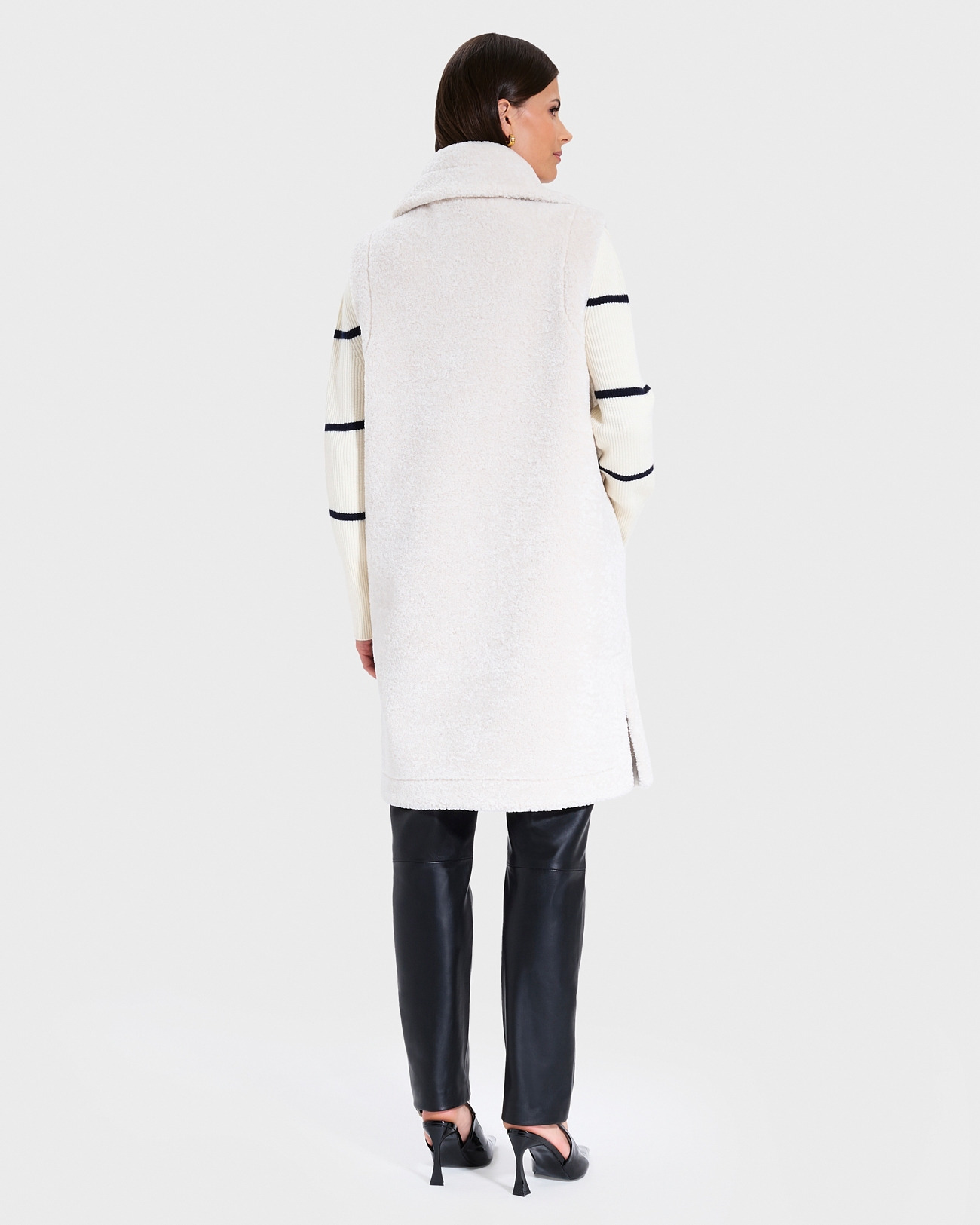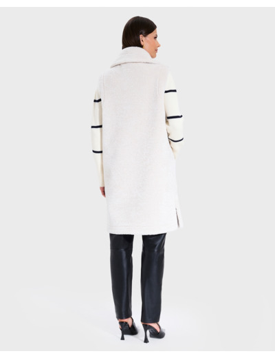 Ce manteau long façon fourrure se pare d'un col tailleur et séduit par sa coupe sans manches.