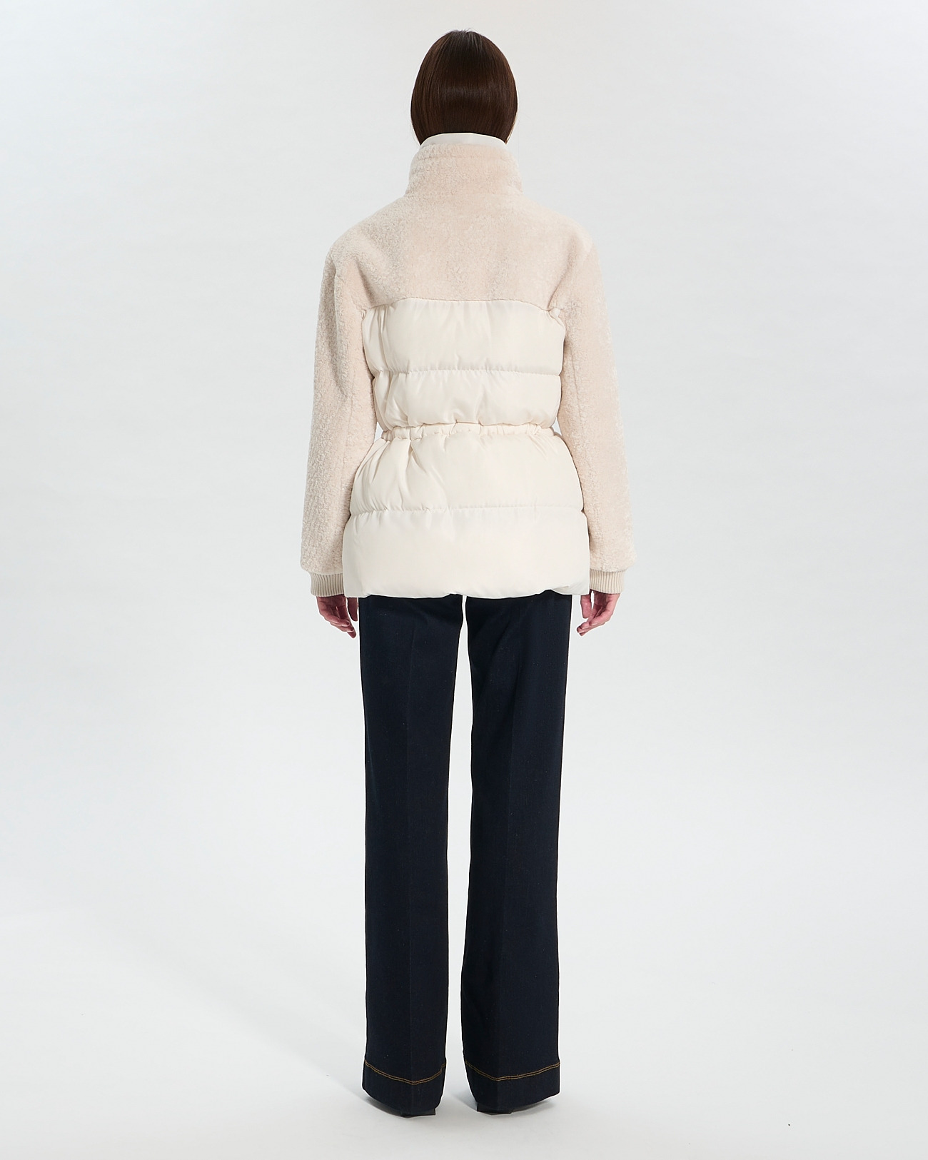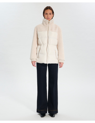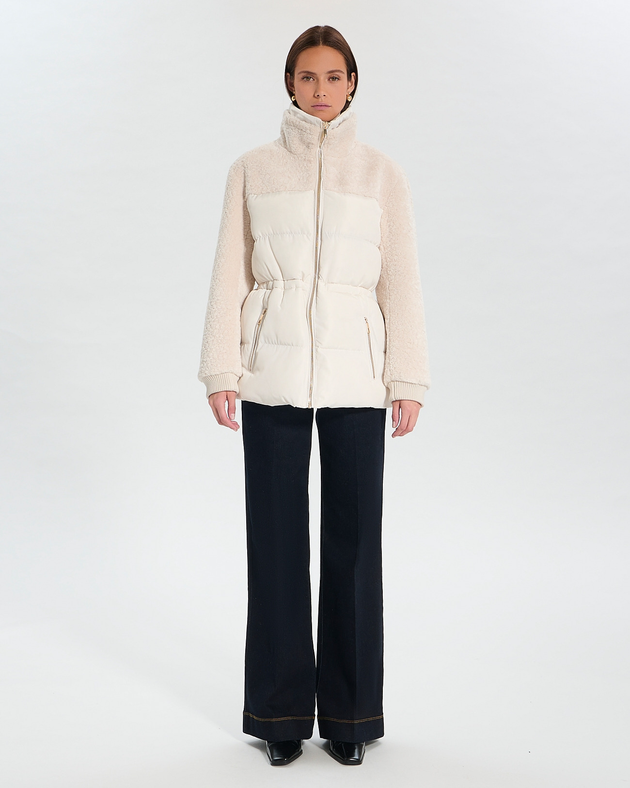 Ce manteau en fausse fourrure bi-matière se distingue par son col montant et sa coupe ajustée à la taille, mettant en valeur la silhouette.