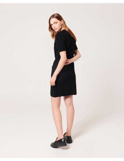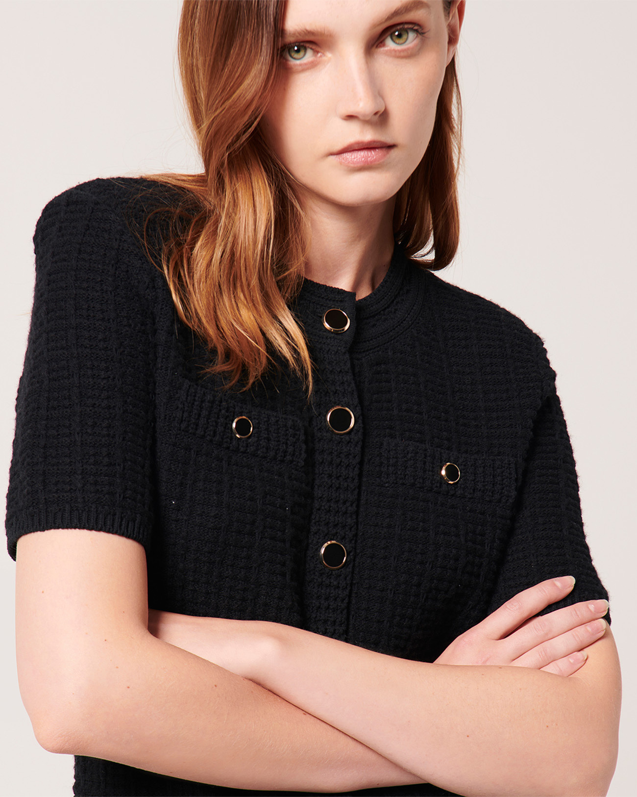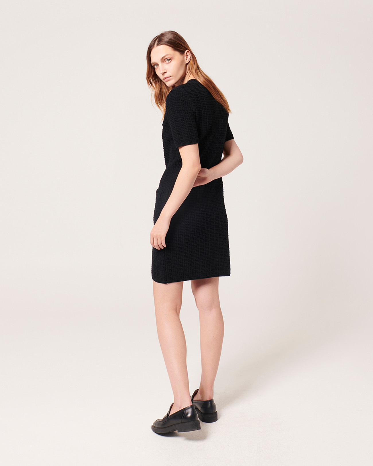 On mise cette saison sur une petite robe noire façon tweed qui séduit par sa texture en relief et son col arrondi.