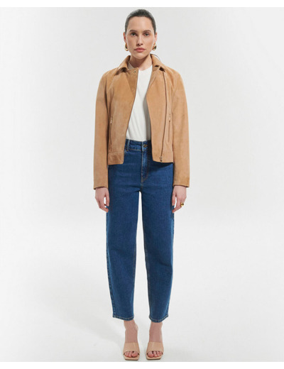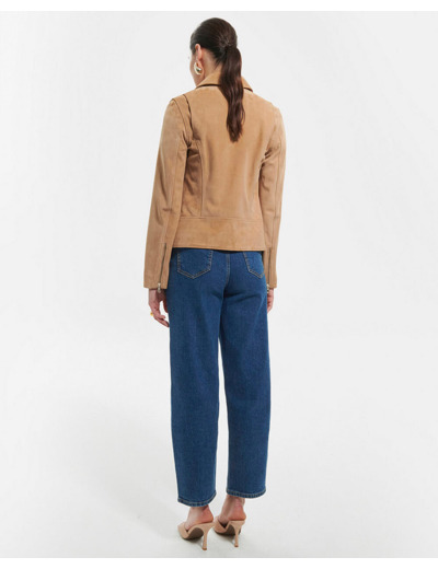 Réalisé dans une jolie matière suède, cette pièce aux finitions piquées se ferme à l'aide d'un zip asymétrique.
